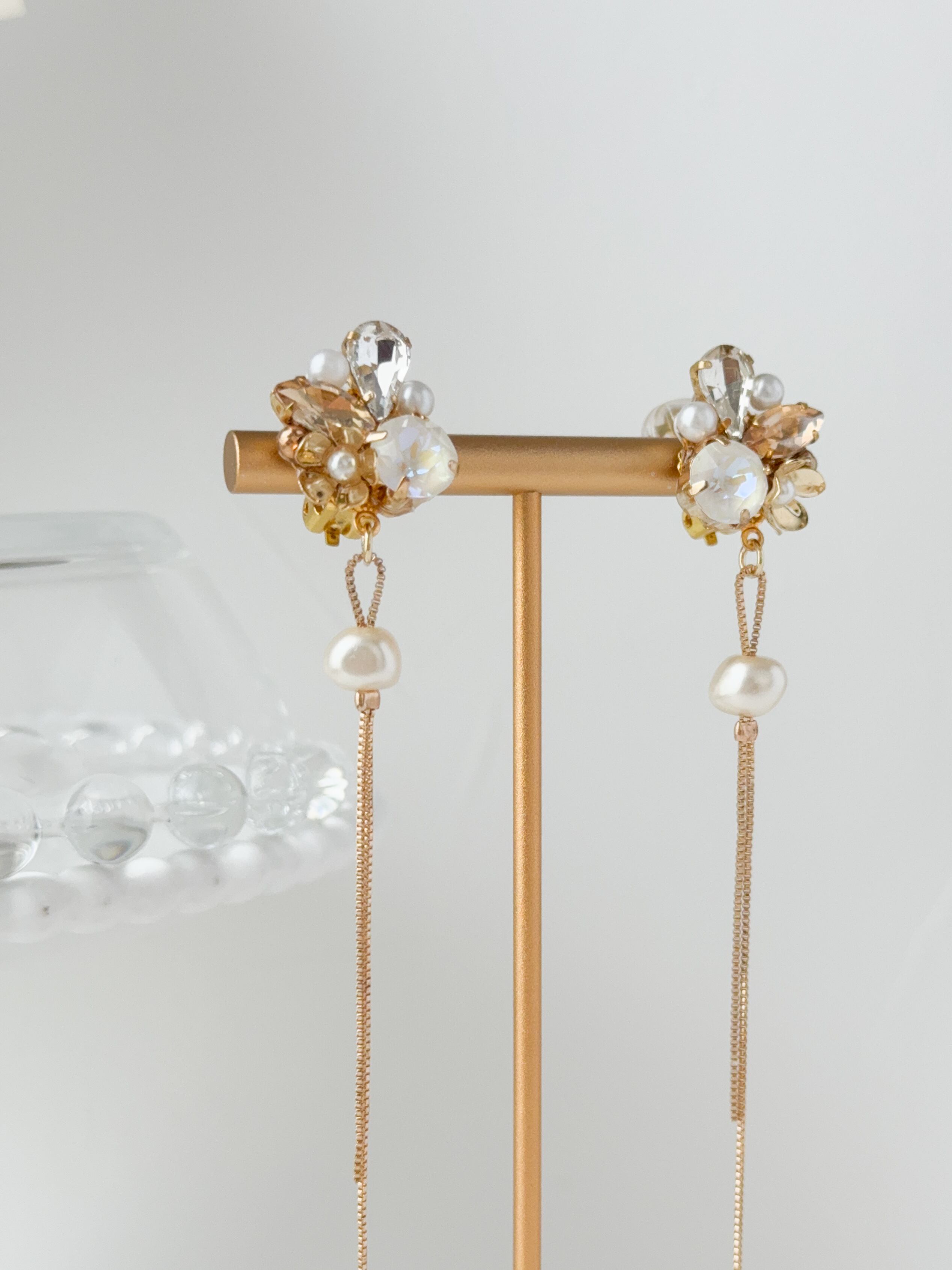 上品な輝きを放つビジューに、ひと粒のパールを添えたエレガントなデザイン。